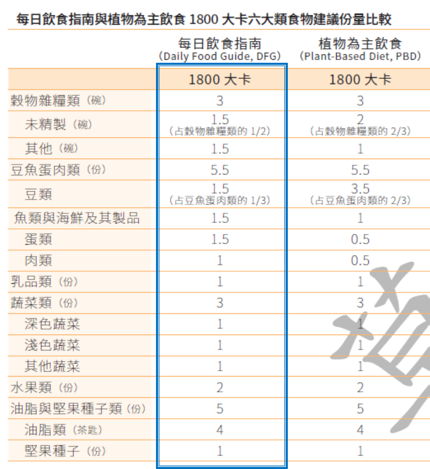 而「植物為主飲食」則是黃豆製品約佔60%、魚類與海鮮及其製品約佔20%、家禽畜肉約佔10%、蛋類約佔10% (頁82)。這與2018年每日飲食準則的黃豆製品約佔20%、魚類與海鮮及其製品約佔30%、家禽畜肉約佔40%、蛋類約佔10%,可說是以豆類取代部分肉類的精準推薦。