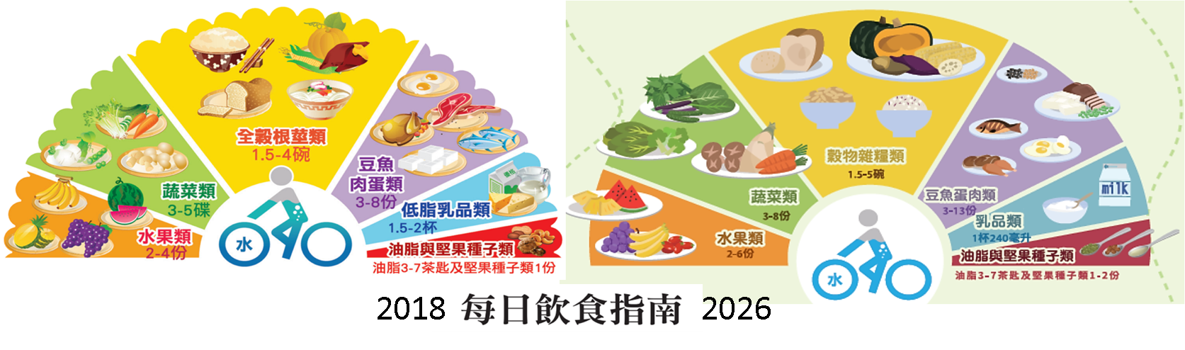 圖1,國健署每日飲食指南2018年版與2026年版(草案)的示意圖。