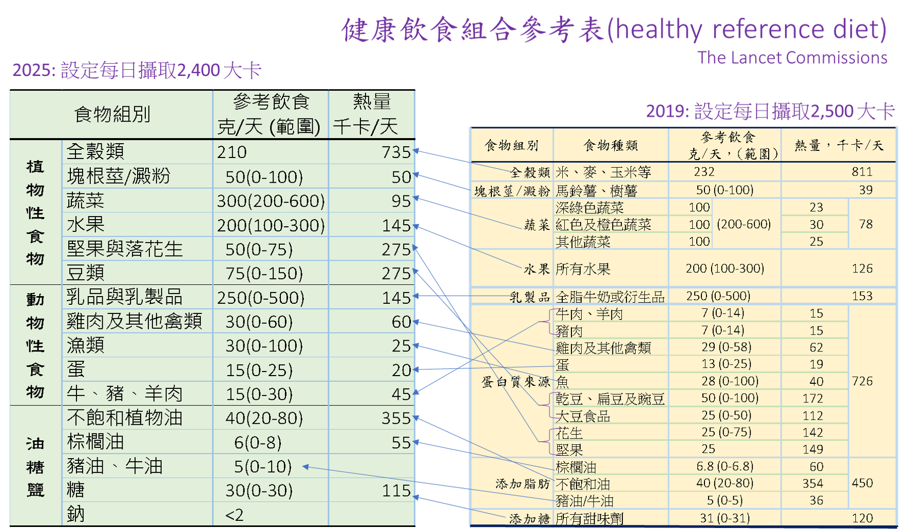 頁21的圖與頁26的表,建議採用行星健康飲食的作法,把食材重新歸類(如表3,2019年或者2026年都適合)。